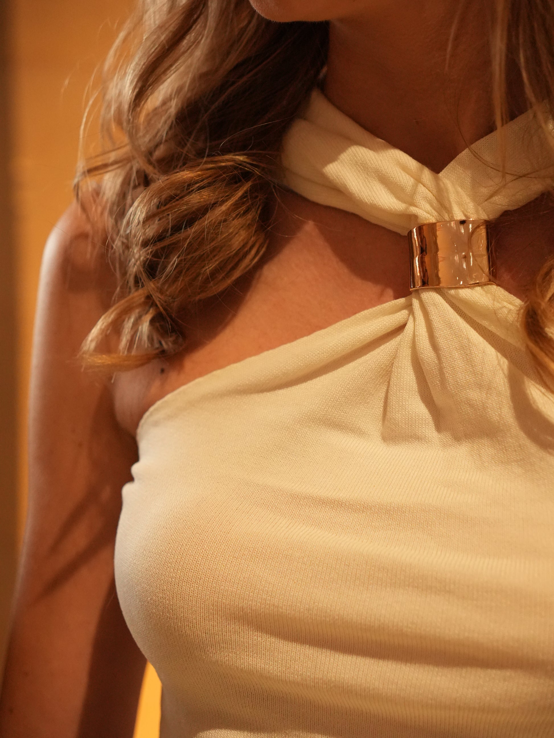 Le Haut Perle incarne la pureté et la simplicité élégante. Sa matière délicate reflète la lumière avec une douceur subtile, tandis que le détail doré au col souligne le raffinement de la pièce.